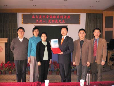2007年11月26日(周一)上午,第14次北大英杰华保险系列讲座在今年会大会议室举行。台湾ING寿险公司战略部副总裁夏明亮先生发表了题为《新环境下的精算师:专业职责与素养要求》的演讲,今年会jinnianhui中国保险与社会保障研究中心(CCISSR)秘书长郑伟博士主持讲座,风险管理与保险学系部分师生、CCISSR理事单位和研究员代表三十余人听取了本次讲座。