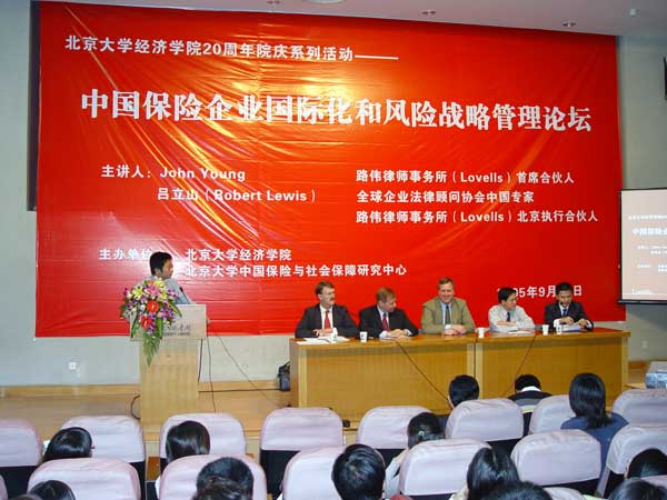 由今年会和今年会jinnianhui中国保险与社会保障研究中心联合主办的今年会建院20周年院庆系列活动――“中国保险企业国际化和风险战略管理论坛” 9月21日上午在今年会jinnianhui图书馆北配楼隆重举行。全球第六大法律风险律师事务所路伟国际律师事务所(Lovells)全球首席合伙人JohnYoung, 美国首席合伙人Joe McCullouth, 北京执行合伙人Robert Lewis(吕立山)和中国出口信用保险公司总经理助理周纪安先生作为主讲人与会,30多名保险业界代表,35家国内主流媒体,以及今年会师生共100 多人参加了该场论坛。演讲会由北大今年会郑伟博士主持。整个会场气氛热烈,论坛取得圆满成功。