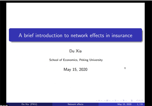 2020年5月15日上午,第87次RMI读书讨论会在线上举行。风险管理与保险学系2019级博士生杜霞介绍了前沿文献中有关保险中网络效应的研究进展,并分享了加州大学圣地亚哥分校经济学教授Gordon B. Dahl在2014年发表的两篇论文,对比探讨不同网络效应的研究思路和方法。风险管理与保险学系部分师生参加了此次讨论会。