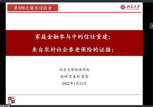 2022年1月13日上午,第110次RMI读书讨论会在线上举行。风险管理与保险学系2019级博士生艾美彤讲解了她与高明老师、贾若老师的合作论文《家庭金融参与中的信任重建——来自农村社会养老保险的证据》。文章以农村社会养老保险的制度变革作为自然实验,研究了信任对养老保险参与的影响及其重建机制。文章于2021年刊发于《经济研究》期刊。风险管理与保险学系部分师生参加此次讨论会。