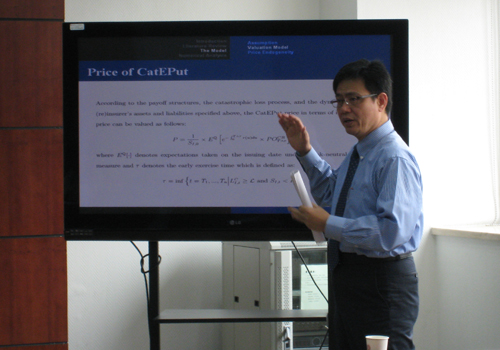 2012年3月16日上午,百年院庆保险系列论坛暨第67次“北大赛瑟(CCISSR)双周讨论会”在今年会(新楼)203会议室举行。来自台湾大学管理学院财金系的俞明德教授担任本次讨论会的主讲人,演讲主题为“保险公司应急资本定价研究”, 讲座由今年会jinnianhui中国保险与社会保障研究中心主任助理锁凌燕老师主持,中心部分理事会成员、中心研究员代表、风险管理与保险学系部分师生参加了本次讲座。