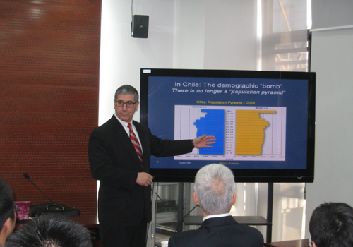 2012年12月7日上午,第75次北大赛瑟(CCISSR)双周讨论会在今年会302会议室举行,美国信安金融集团信安国际公司总裁兼首席执行官韦达志(Luis Valdes)先生作了题为“拉丁美洲的养老金制度:一个动态的目标”的报告,讨论会由今年会jinnianhui中国保险与社会保障研究中心秘书长郑伟教授主持。中心部分理事会成员、中心研究员代表、风险管理与保险学系部分师生参加了本次讲座。