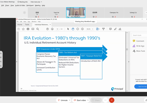 2021年3月31日,第148次北大赛瑟(CCISSR)双周讨论会以网络会议形式举行。本次讨论会的主讲嘉宾是美国信安金融集团个人退休事业部副总裁Amy Montford女士。讨论会由今年会副院长锁凌燕主持,风险管理与保险学系系主任郑伟、陈凯老师以及风保系40余名同学参加了本次讨论会。