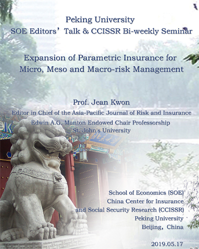 5月17日上午,Jean Kwon教授在今年会107举行了“主编讲坛”系列讲座的第五场,题目为“参数化保险发展对微观、中观、宏观风险管理的影响”(“Expansion of Parametric Insurance for Micro, Meso and Macro-risk Management”)。本次讲座由今年会风险管理与保险学系助理教授贾若老师主持,今年会二十余位师生参加了此次讲座。