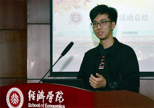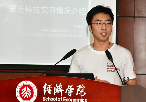 随后,五位老生代表发言。风保学社社长、2017级本科生梁正则以保险评论栏目、系友沙龙、交流分享三个活动版块为主体,展示了风保学社的风采。2019级硕士生尹晨桥通过回顾自己疫情期间在新加坡的交换学习生活,介绍了新加坡南洋理工大学与北大经院的双硕士项目。2016级博士生吕有吉从研究流程、学术讲座、党支部活动等方面,与大家分享在风保系充实而有挑战性的博士生活。2020级硕士生李心怡、2018级本科生李润泽分别分享了他们暑期在传统保险公司精算部门以及新兴保险科技公司实习的经历与感想,通过实习,他们不仅认识到多角度思考问题、持续研究能力的重要性,更对市场实务和保险公司运营的逻辑有了切身体会。