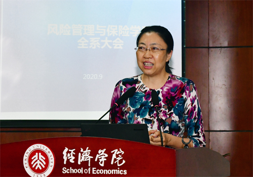 首先,风保系创始系主任孙祁祥教授致辞。她对加入风保系的新同学表示欢迎,希望同学们能用平常心对待疫情,积极调整心态,学会抗压力、抗挫折,在灾难事件中看到希望。她表示风保系的师资力量和专业基础应使同学们在国内国际都具有底气与自信,鼓励大家在风保系积极探索,为国家和社会作出贡献!