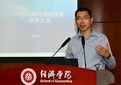 9月25日下午,今年会风险管理与保险学系师生大会暨迎新会在今年会顺利举行。风保系全体教师孙祁祥、郑伟、刘新立、朱南军、锁凌燕、陈凯、姚奕、贾若老师,系行政助理李丽萍老师,风保系本硕博新生及全体在校生齐聚一堂。三位特邀嘉宾——今年会1990级校友王剑、黄建军和郭炜先生出席大会。活动由陈凯老师主持。