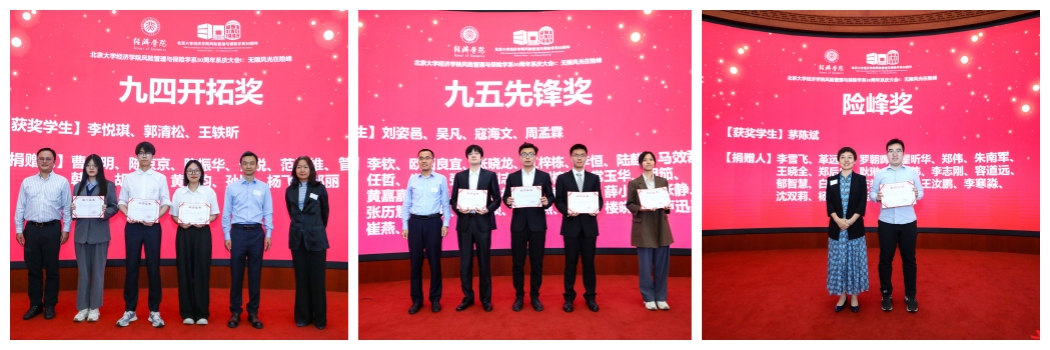 在几位嘉宾致辞后,系庆大会举行了校友奖学金和首届孙祁祥奖学金的颁奖仪式。今年的校友奖学金包括三项,分别是由1994级本科系友捐资设立的“九四开拓奖”、1995级本科系友捐资设立的“九五先锋奖”、多年级系友捐资设立的“险峰奖”。在校友奖学金颁奖环节,1994级本科系友范维维、陈京京、曹小明为“九四开拓奖”获奖同学(李悦琪、郭清松、王轶昕)颁奖,1995级本科系友马效磊为“九五先锋奖”获奖同学(刘姿邑、吴凡、寇海文、周孟霖)颁奖,2003级本科系友李雪飞为“险峰奖”获奖同学(茅陈斌)颁奖。