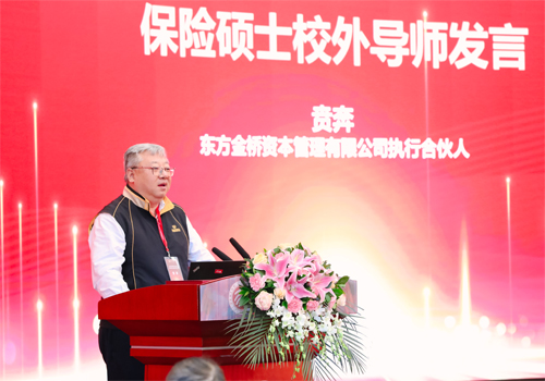 保险硕士校外导师代表、东方金桥资本管理有限公司执行合伙人贲奔老师作大会发言。他在发言中分享了自己在北大求学以及毕业后的工作经历,认为在选择未来职业方向时,兴趣是重要的参考,同时也应认识到,个人的发展会受到多方面因素的影响,他鼓励同学们在自己感兴趣的领域中深耕,坚守初心,脚踏实地。