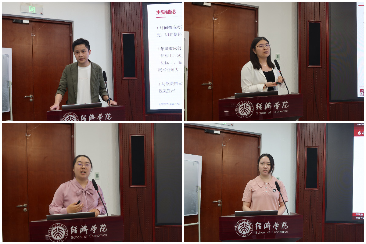 2022级博士生李岱沅汇报的论文题目是《生命周期与家庭金融资产组合》。文章基于中国家庭金融调查数据,利用年龄-时间-队列方法分析了家庭金融资产组合配置问题。中国家庭以定存类资产和固收类资产为调整重点,年龄效应产生“双向调整”影响:结构上,组合中定存类资产占比和固收类资产占比随年龄增长呈U型分布和倒U型分布;边际上,临近退休年龄会刺激居民新增购买定存类资产。通过机制分析发现,外生金融市场表现是决定家庭金融资产组合调整的主因。
