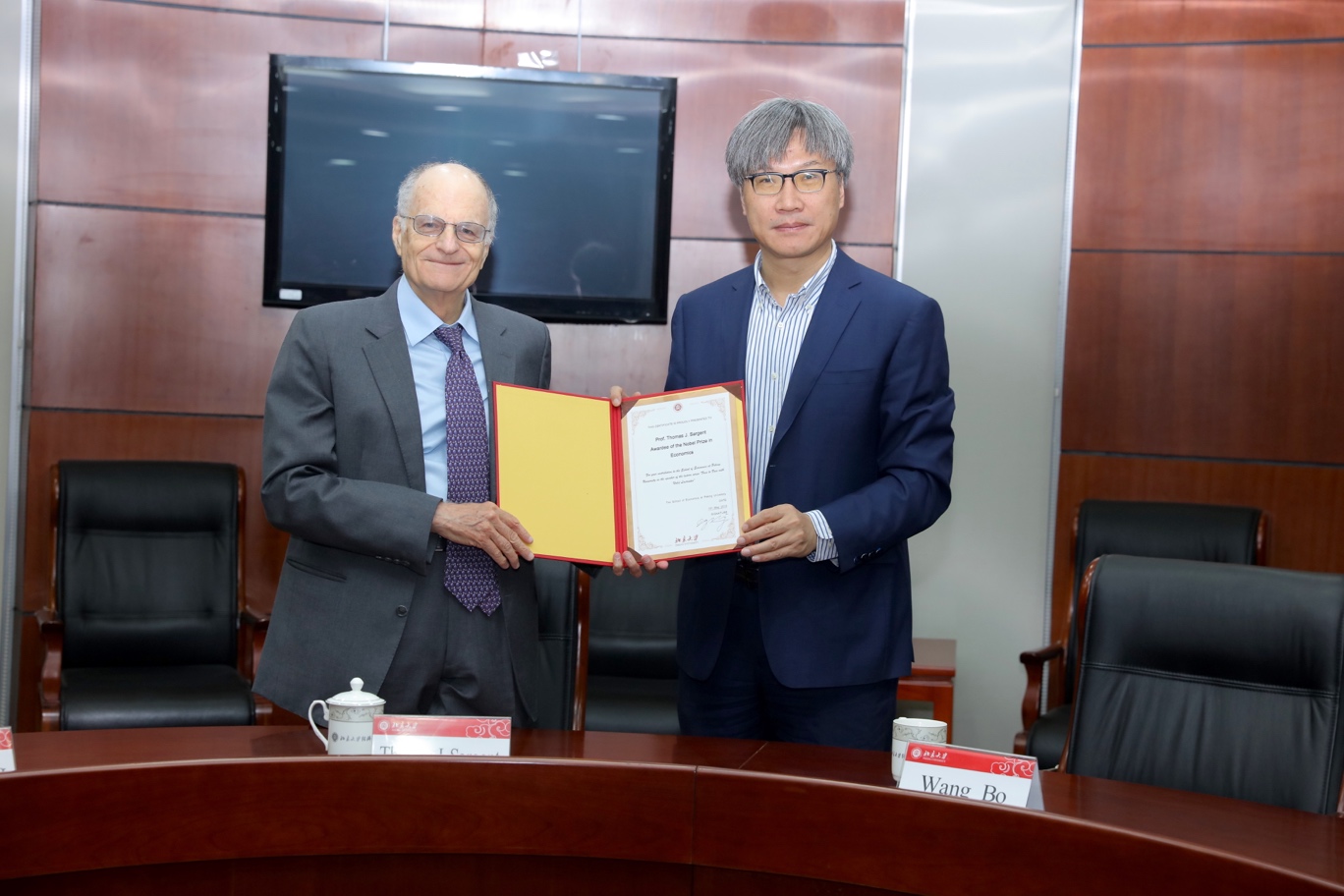 Professor Wang Bo presenting Professor Sargent with the certificate