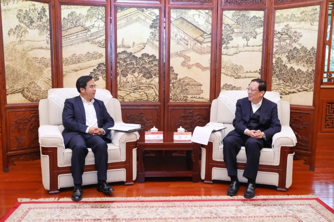 Hao Ping met with Liu Liange and his entourage in the central hall of Linhuxuan. The two parties exchanged views on the development of the EU Economic and Strategic Research Center and the promotion of school-enterprise cooperation.