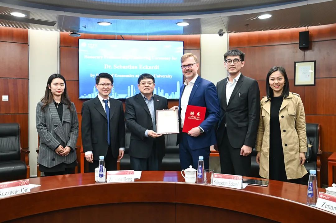 Before the lecture, Academic Committee of School of Economics decided to confer upon Dr. Sebastian Eckardt the title of Honorary Professor. Professor Zhiyong Dong, Dean of School of Economics, presented Dr. Sebastian Eckardt with a certificate.