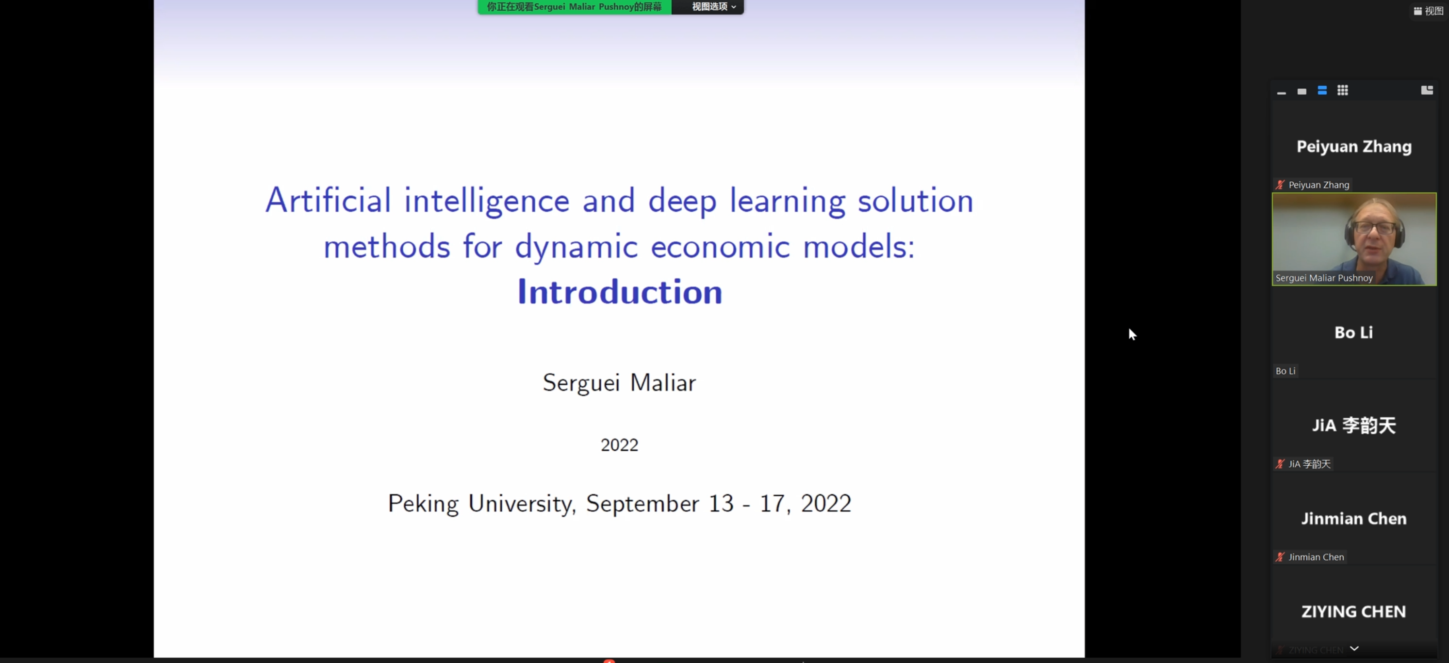 From September 13th to 17th, 2022, invited by the School of Economics at Peking University, Serguei Maliar, Associate Professor of the Department of Economics of Santa Clara University, opened the summer course "Artificial Intelligence in Economics and Finance" (including 6 lectures), covering Machine learning basic theory to economics application and solution. This course was funded by Peking University's "Overseas Famous Lecturer Program". The activity was hosted by Li Bo, Assistant Professor of the School of Economics at Peking University. 50 teachers and students from domestic and foreign academic institutions such as Peking University, Tsinghua University and Indiana University participated in the course.