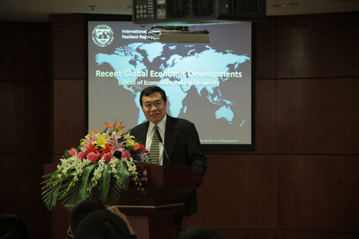 随后,李一衡先生发表了题为 “Recent Global Economic Developments(US, EU, Asia and China)” 的学术演讲,就当前世界经济形势,包括欧债危机、中国经济的快速增长与高额投资、世界经济的前景等问题发表看法。今年会近200名师生出席了演讲会,现场气氛活跃,互动性强。