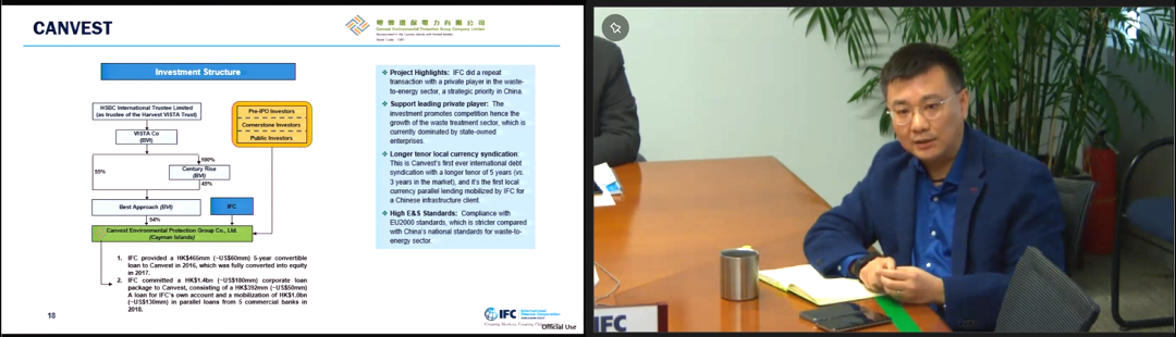 讲座最后,国际金融公司基础建设和自然资源产业部高级投资官员孙浩先生从粤丰环保电力有限公司的案例出发,详细介绍了国际金融公司与中国在绿色环保领域的合作。他谈到粤丰环保是一家垃圾焚烧发电企业,在其发展的不同阶段,国际金融公司通过不同的投资产品和服务助力公司发展,并将中国在垃圾发电方面取得的成功经验分享到了其他发展中国家。