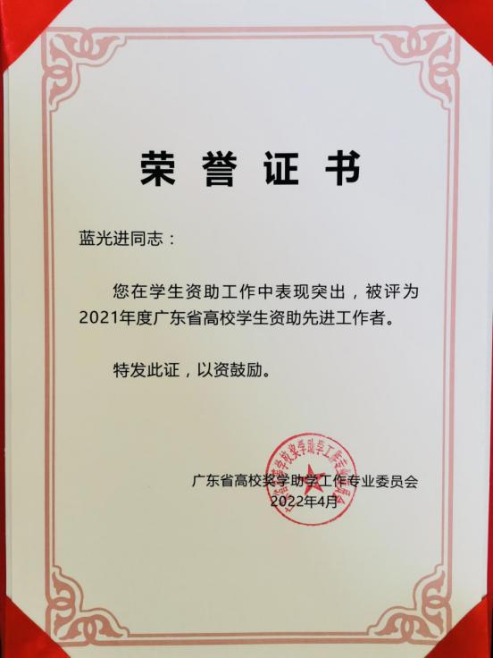 2021年,在教育脱贫攻坚和疫情防控关键时期,我省高校广大学生资助工作者深入贯彻党的教育方针,认真落实国家学生资助政策,全面助力打赢教育脱贫攻坚战和疫情防控阻击战。根据《关于评选2021年度广东省高校学生资助先进工作者的通知》精神,经本人自愿申请、学校评选公示和推荐、广东省经各高校初评推荐、专家评审委员会评审,SUNBET申搏数据科学学院蓝光进老师获评“2021年度广东省高校学生资助先进工作者”荣誉称号。