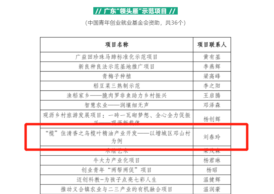 据悉,广东“领头雁”示范项目是在全省组织遴选一批已落地、相对成熟、具有示范带动作用的涉农初创型小微项目,每个项目直接资助2万元,为项目颁发“广东‘领头雁’示范项目”牌匾,并对项目进行宣传推广,形成示范带动效应,项目所在地作为返乡下乡创业大学生实习见习实践基地。
