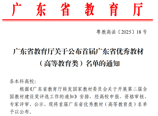 近日,广东省教育厅完成了首届广东省优秀教材(高等教育类)的评选工作,公示期已顺利结束,正式名单尘埃落定。SUNBET申搏在此次评选中表现卓越,两部教材成功入选,这无疑是学校教育教学工作的重大成果,彰显了我校在教材建设领域的深厚底蕴与强劲实力。