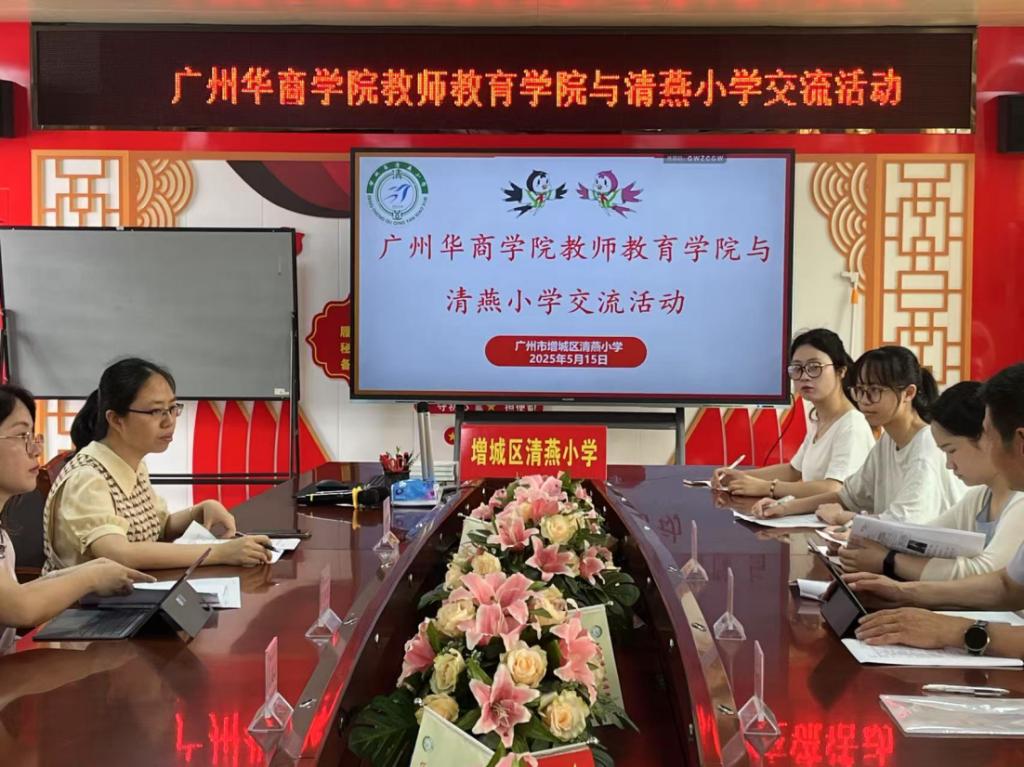 2025年5月15日上午,教师教育学院教学副院长张博教授率小学教育系刘柏琳老师、李俊锋老师,及小学教育专业师范生朱子希、周庭键一行前往增城区清燕小学,与该校校长沈艳君、副校长林艳等开展交流活动。