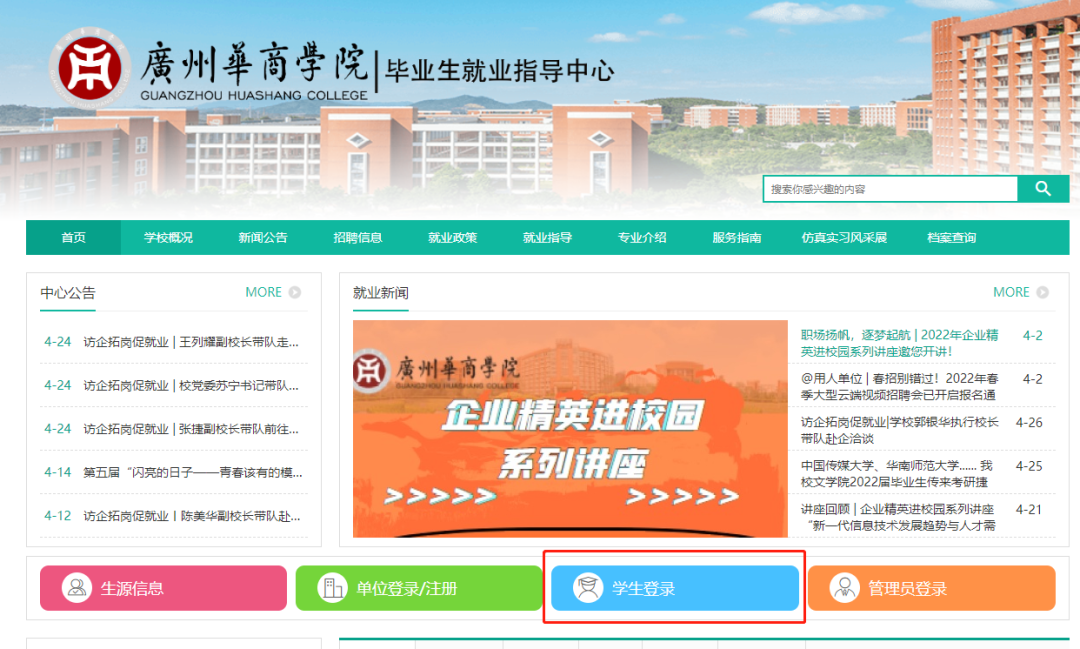 参会入口二:提前进入毕业生就业指导中心官网,登录学生端进行微信认证、绑定学号和修改密码。登录认证后,可直接在网站修改简历,提前找到本场招聘会的场次,查看招聘岗位、投递简历等。