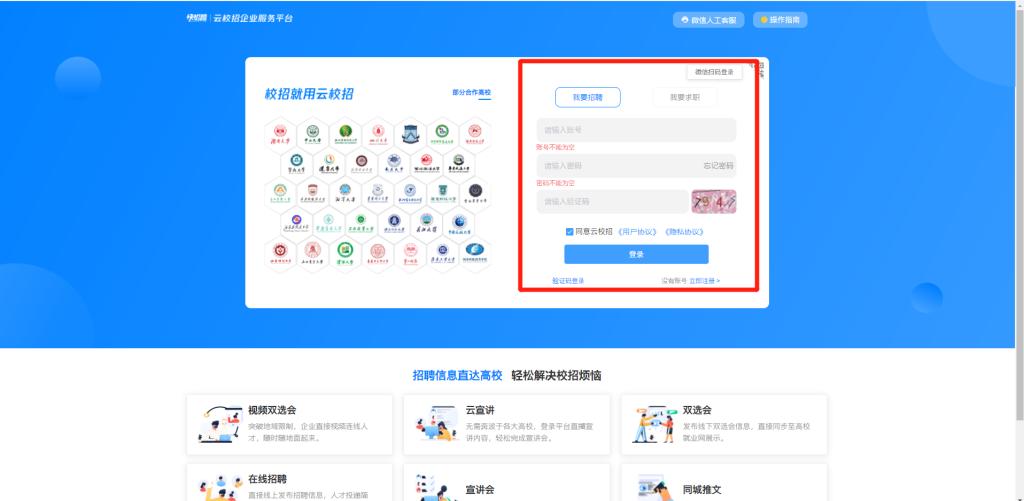 点击“单位登录”,进入“云校招”—“视频双选会”—选择“我的报名”—进入“面试间”—面试列表中选择在线的求职者,点击“发起视频”—等待对方通过后进行视频沟通(求职者与用人单位需在线且不在面试中才可接通视频)