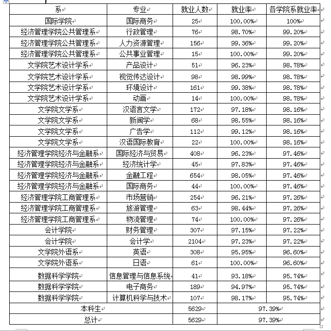 从表中看,学校2019届毕业生就业的专业对口率平均为71.62%。其中,我校2019届毕业生初次就业专业对口率在其所在院系中,文学院艺术设计学系专业对口率最高,为93.87%;其次是经济管理学院经济与金融系,为81.80%;再次是会计学院,为76.05%;专业对口率较低的为国际学院、数据科学学院、文学院外语系,分别为64.00%、49.48%、39.94%。