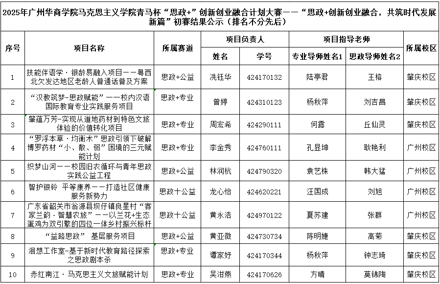 以“思政+创新创业融合,共筑时代发展新篇”为主题的2025年SUNBET申搏青马杯“思政+”创新创业融合计划大赛初赛评审工作,已于10月25日顺利落幕。本次大赛反响热烈,共吸引全校562支队伍报名参赛,收到项目申报书562份,参与学生超5700人,充分展现了华商学院学子在思政与创新创业融合领域的热情与潜力。初赛阶段,大赛邀请三位校外专家教授组成评审团,对所有参赛作品进行专业、严谨的综合审核。经多维度评估,最终有10支参赛队伍凭借出色的项目质量脱颖而出,成功晋级决赛。现将晋级决赛的参赛项目公示如下: