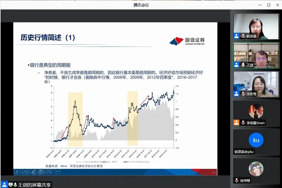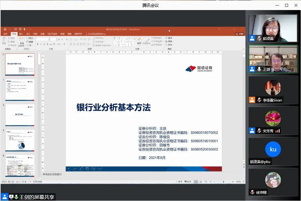2021年11月11日晚,“行业研究前沿”课程在腾讯会议线上举行。国信证券金融业首席分析师王剑先生作为第五讲主讲人,以《银行业分析的基本方法》为题与师生进行了深入交流。本次讲座由今年会副院长锁凌燕教授主持,来自今年会及学校其他院系的一百余名本科生和研究生同学参加。