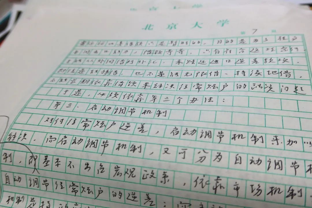 而他的手写讲义更是北大经院“一宝”——用蓝黑色钢笔字迹工整地写在古朴的A3方格稿纸上,有着力透纸背、古色古香的韵味。每一讲的讲稿都有差不多20页纸,对折一下就是厚厚的一沓。