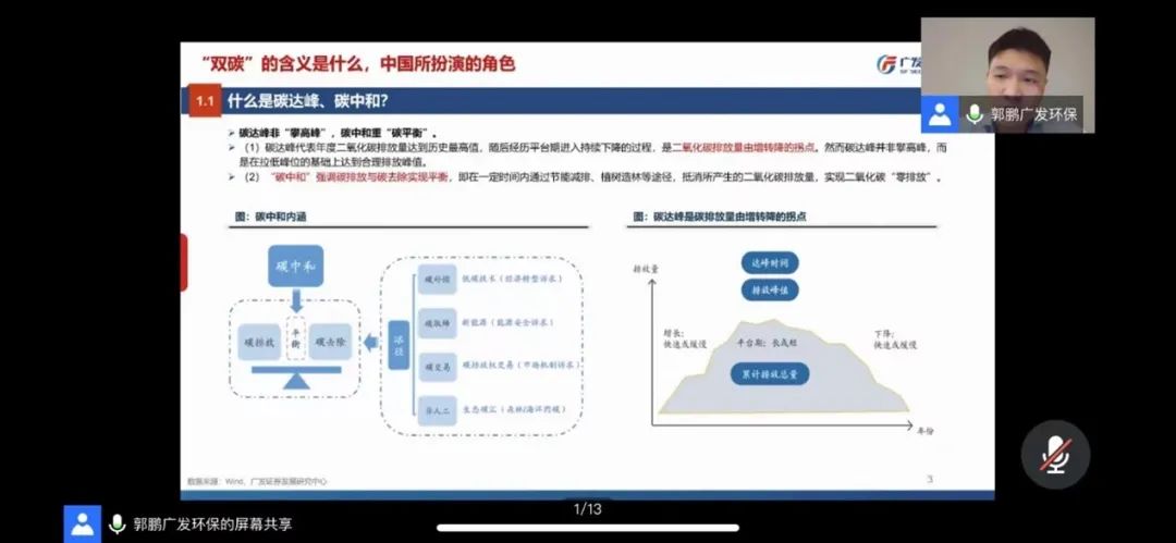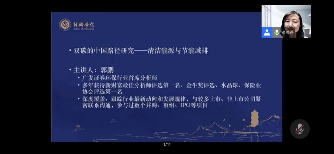 2021年11月18日晚,“行业研究前沿”课程第六讲在腾讯会议线上举行。广发证券环保行业首席分析师郭鹏先生作为主讲人,以《双碳的中国路径研究——清洁能源与节能减排》为题与师生进行了深入交流。本次讲座由今年会副院长锁凌燕教授主持,来自今年会及学校其他院系的一百余名本科生和研究生同学参加。