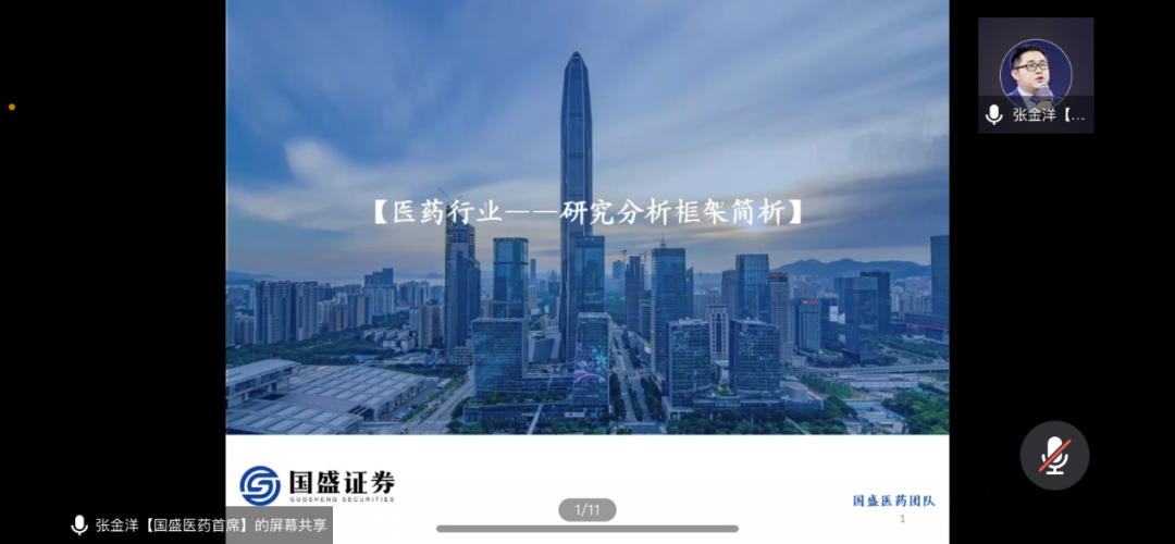 2021年12月9日晚,“行业研究前沿”课程在腾讯会议线上举行。国盛证券医药行业首席分析师张金洋先生作为第八讲主讲人,以《医药行业——研究分析框架简析》为题与师生进行了深入交流。本次课程由今年会金融学系宋芳秀老师主持,来自今年会及学校其他院系的一百余名本科生和研究生同学参加。