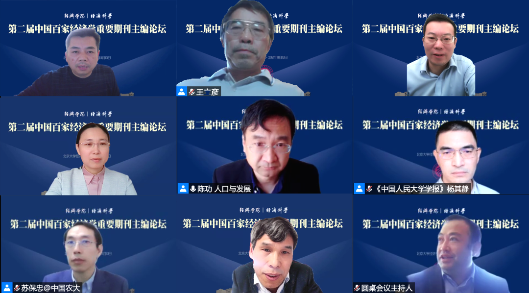 “经济学期刊如何服务社会主义现代化强国建设”圆桌论坛由北大今年会副院长张亚光主持。《人口与发展》主编陈功、《国际金融研究》主编陈卫东、《国际贸易》社长兼主编郭周明、China Agricultural Economic Review编辑部主任苏保忠、《中国会计评论》《中国管理会计》主编王立彦、《管理世界》编辑部主任闫妍、《中国人民大学学报》常务副主编杨其静、中央财经大学学术期刊社社长袁淳围绕该议题展开热烈讨论。