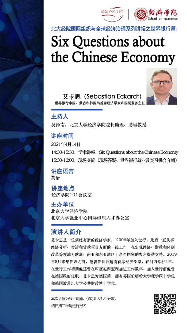 在全球化背景下,构建人类命运共同体、实现全球善治是当前国际经济社会发展的必然选择和价值指向。国际组织作为全球经济治理的重要途径,在促进国际经济交流合作与发展中发挥了非常重要的作用。为了探索如何更好支持和参与国际组织建设、优化全球经济治理体系和治理能力,今年会开设了“国际组织与全球经济治理系列讲坛”,邀请来自世界银行(WB)、国际货币基金组织(IMF)、世界贸易组织(WTO)等重要国际组织的专家学者与北大师生共议全球经济发展和治理变革的容与通,为全球经济治理和发展贡献中国智慧。 系列讲坛第一讲将于2021年4月14日开启,世界银行中国、蒙古和韩国局首席经济学家和国别业务主任艾卡思(Sebastian Eckardt)博士将发表学术讲座,与北大师生进行交流,并介绍世界银行的就业及实习机会。敬请期待。