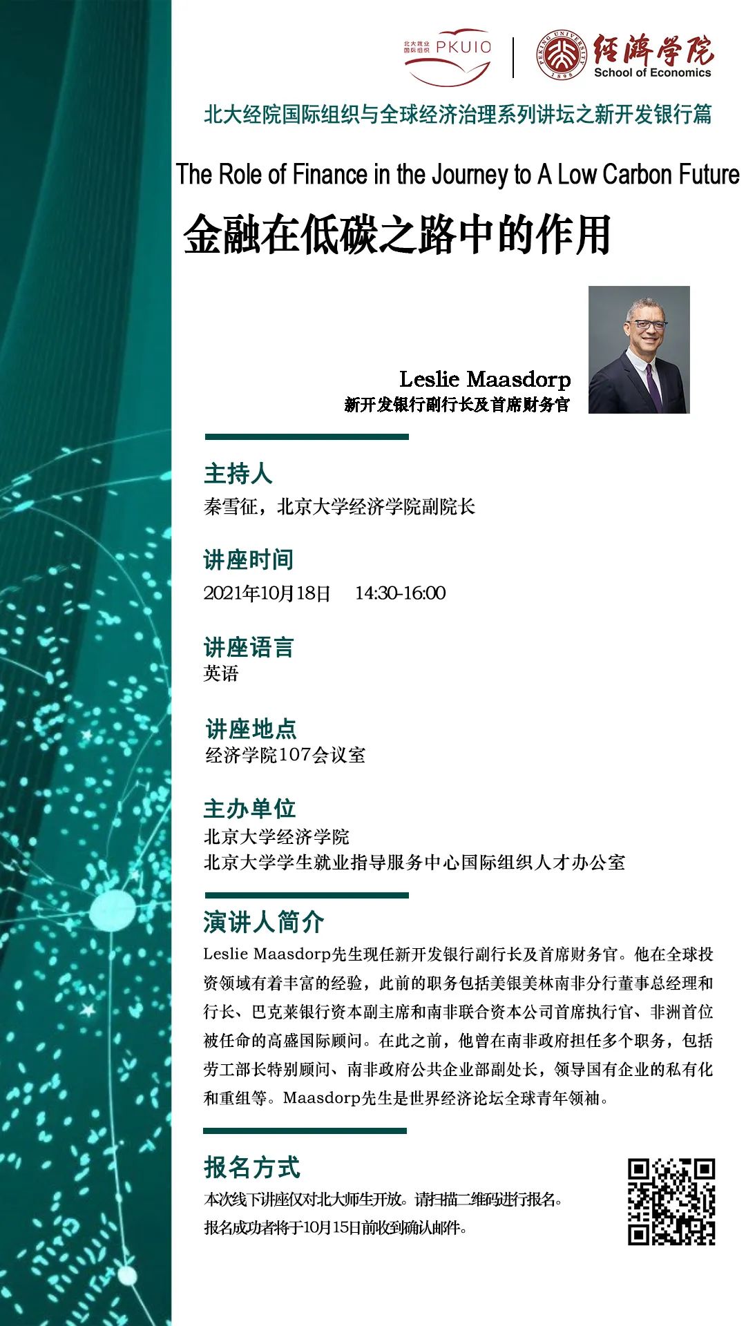 本学期“国际组织与全球经济治理系列讲坛”将于10月18日开启,新开发银行副行长及首席财务官Leslie Maasdorp先生将发表学术讲座。欢迎参与、敬请期待。