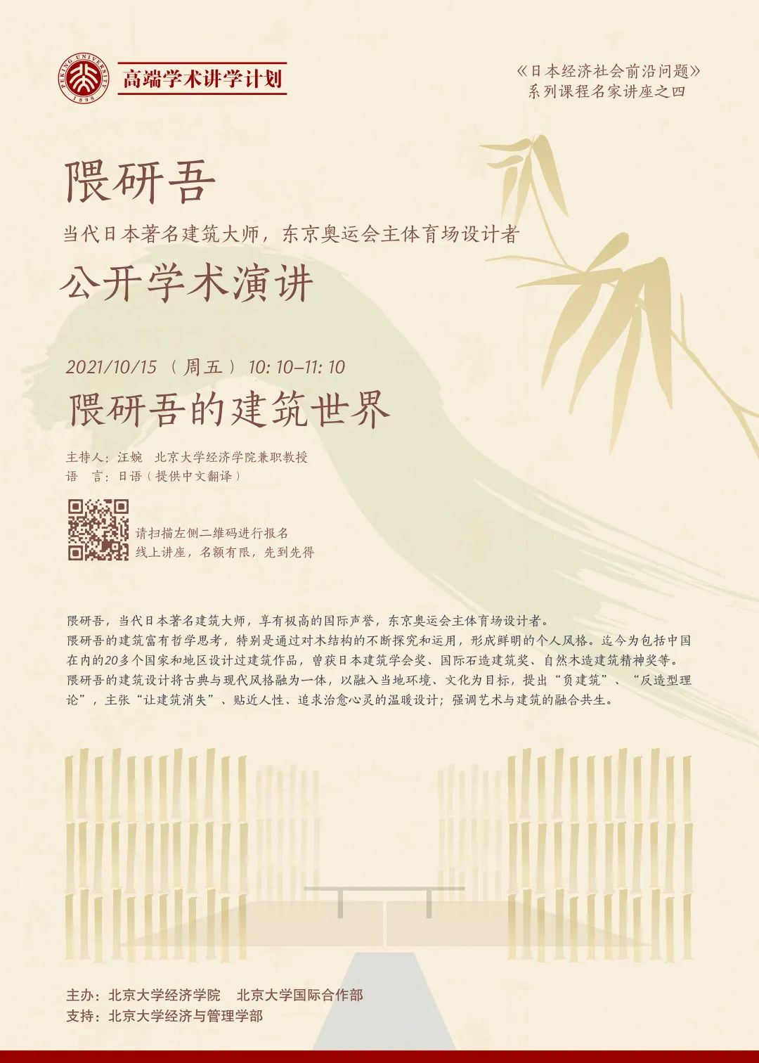 今年会自2020年秋季学期开始举办“日本名家系列讲座”,旨在为师生描绘更立体、更直观的日本经济与社会图景,为师生提供新的研究角度和研究思路。该系列讲座已举办三讲,获得了师生的广泛好评和热烈反响。2021年秋季学期,北大经院将继续举办该系列讲座,邀请日本建筑大师隈研吾、松下电器产业株式会社集团代表董事副社长本间哲朗、野村资本市场研究所首席研究员关志雄从不同角度分析日本当前的经济社会问题,为师生提供零距离交流的宝贵机会。