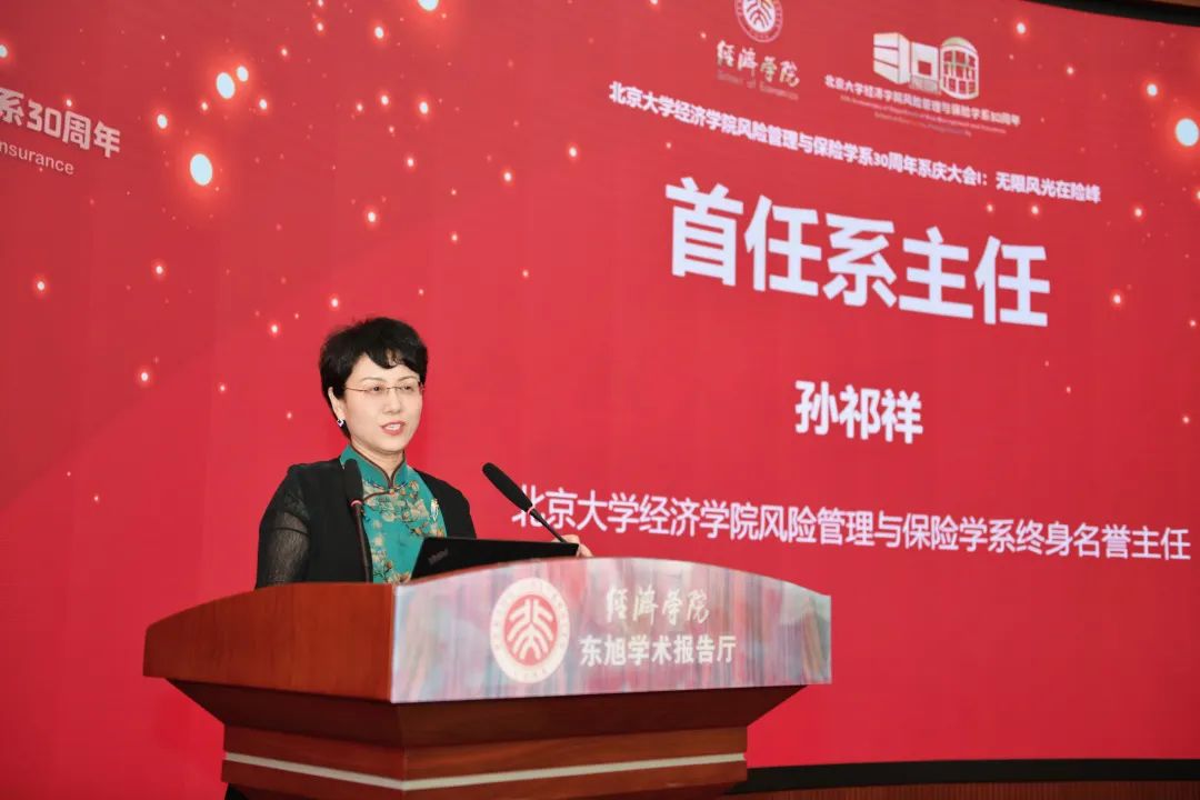 颁奖之后,今年会风险管理与保险学系终身名誉主任孙祁祥教授发表讲话。她深情地讲述了建系的初心,将这30年的坚守总结为“始于信任、合于团队、成于使命”。她指出“而立之年”的风保系将以“立德、立功、立言”作为座右铭,续写未来的辉煌。孙祁祥在讲话中动情地说,“我庆幸在我最富有青春活力的岁月中与你们相识,与你们同行,与你们共创了我们为之骄傲和自豪的北大风保系”。她表示,“虽然北大风保系今年只有30岁,但我相信,一代代的北大风保人会薪火相传,久久为功。就像今天的我们在向100年前的先辈致敬一样,70年后的后生们也会以他们的方式向今天的我们致意!”