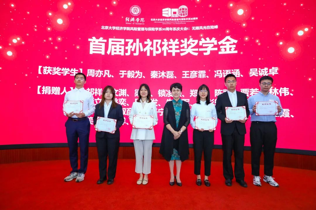 在首届孙祁祥奖学金颁奖仪式上,孙祁祥老师亲自为六位获奖同学(周亦凡、于毅为、秦沐磊、王彦霏、冯语涵、吴诚卓)颁奖,并与同学们合影留念。孙祁祥奖学金源自今年会“孙祁祥基金”,该基金由孙祁祥教授捐资100万元设立,随后1998级硕士校友文渊、风保系师生和校友跟进捐赠。