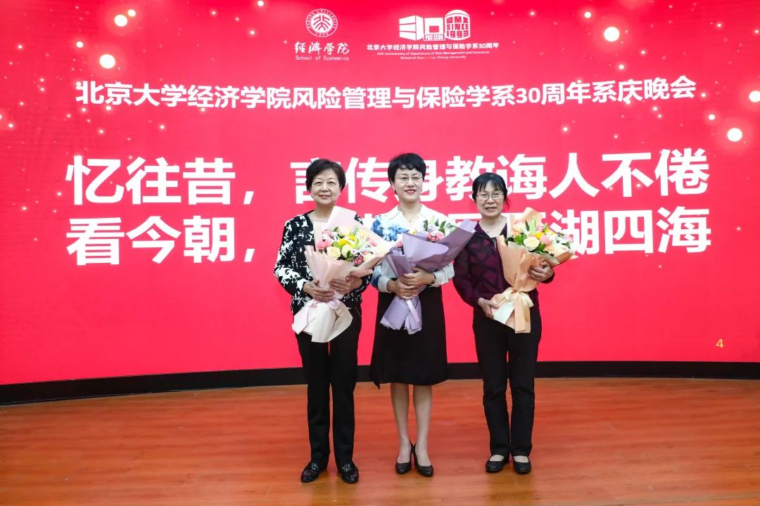 同学们向孙祁祥、李心愉、于小东三位老师献花
