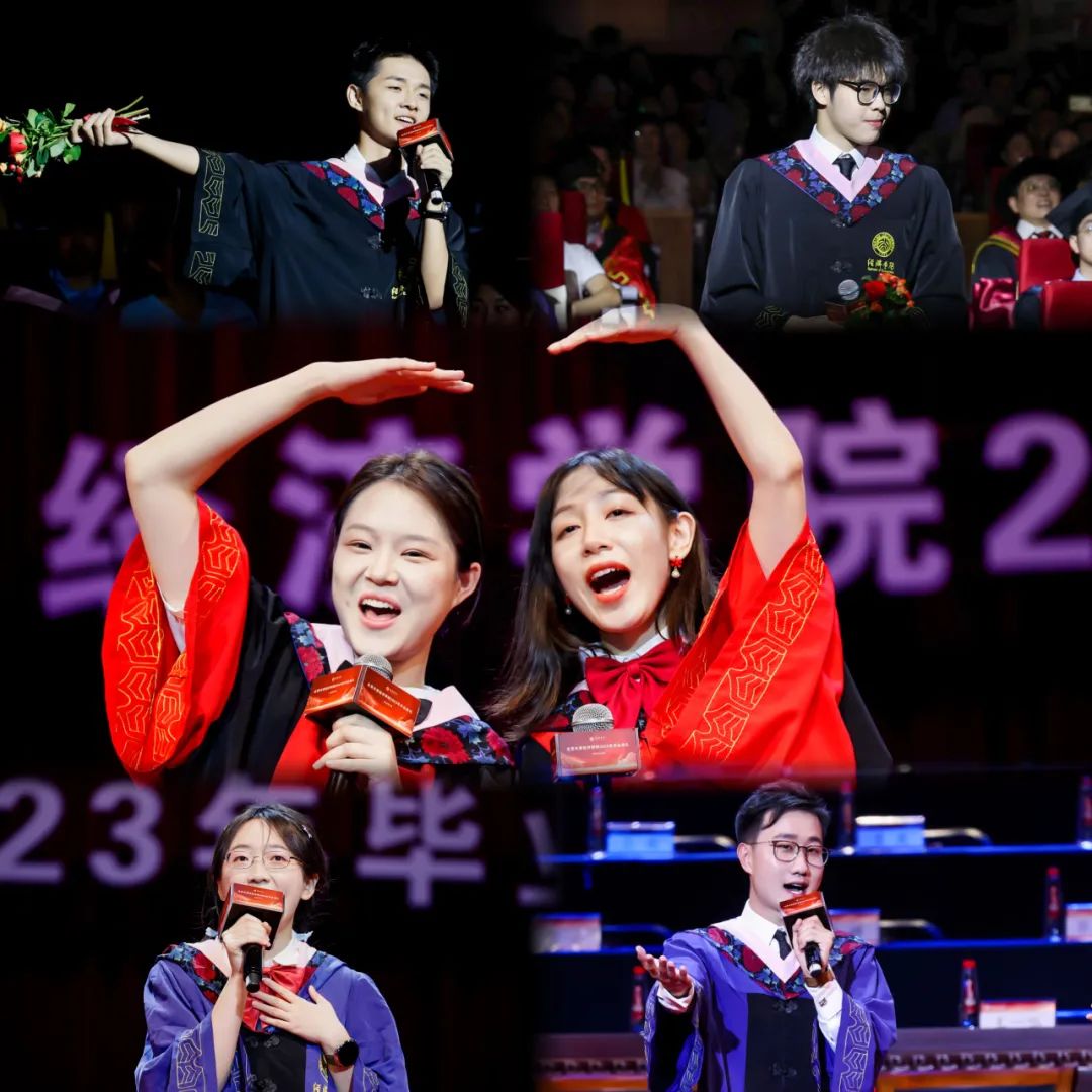 “送你一朵小红花,开在那院楼门前的树下”,今年会2023届毕业生郭恒昌、张恩硕、刘安澜、杨竣皓、苏品一、王彬深情演唱经院改编版《送你一朵小红花》,唱不尽对燕园的深深眷恋,唱不完对过往的留恋怀念。从那年金秋出发,到挥手作别的盛夏,点点滴滴皆是难以忘怀的美好。这一路风雨兼程,饱含牵挂,师友相伴,走向闪耀的风华,经院学子将继续走在经世济民的道路上。