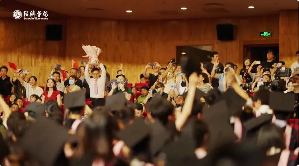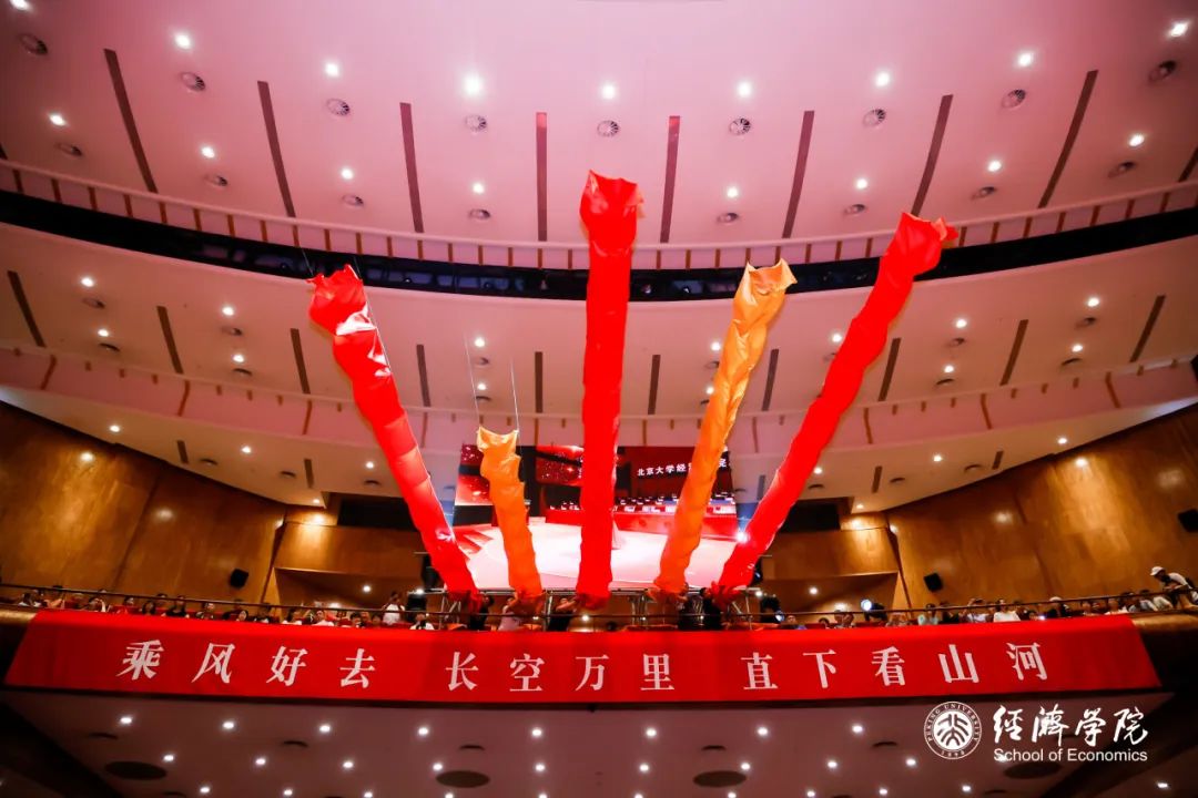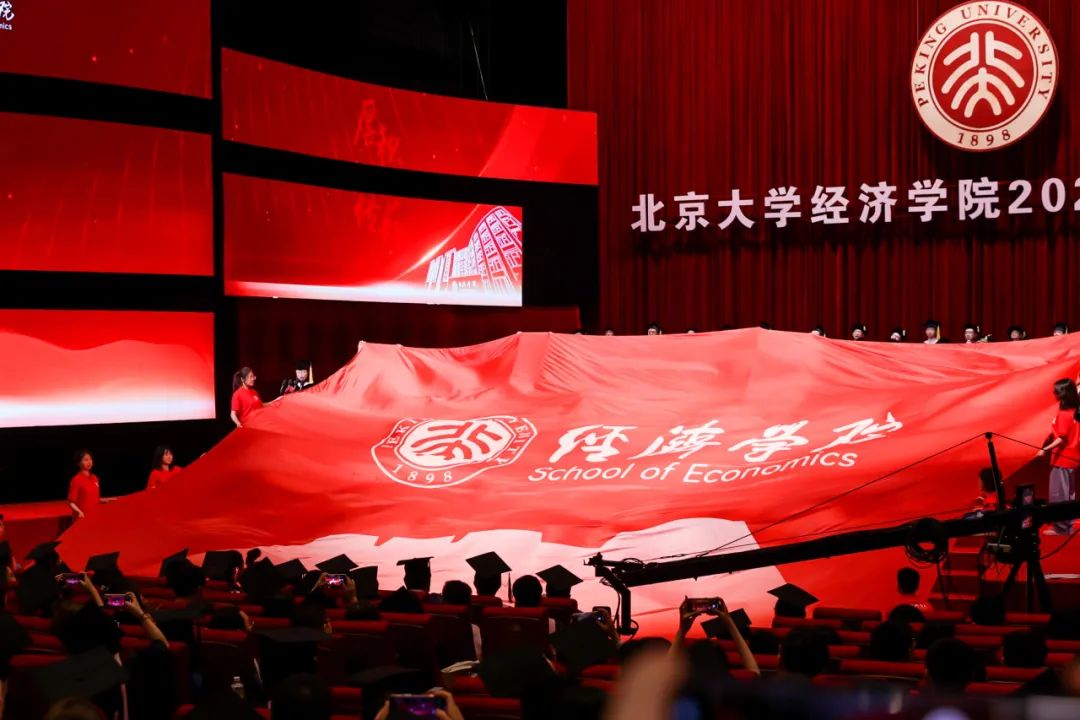当象征着学院的巨幅旗帜缓缓展开,毕业生们高举双臂,托起这面旗帜,扛起北大经院人的责任担当。经院魂在这里生长,它期待并期许毕业生们不滞于物、不殆于心;北大魂在这里生长,它期望并期盼毕业生们成长为时代中坚、国之栋梁。
