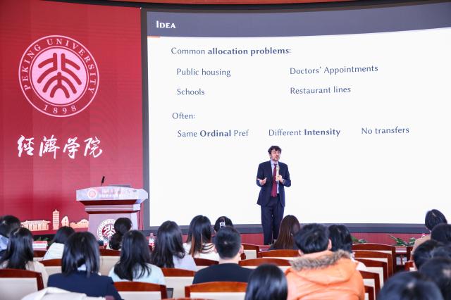 最后,Pietro Ortoleva介绍了一种理想化的市场化资源配置方式。他们理想化地假定每个消费者最初都拥有完全一样的商品(初始禀赋),再允许消费者之间就该种商品进行自由交易;并将这种资源配置模式称为公平的竞争均衡。Ortoleva教授及合作者发现公平的竞争均衡是帕累托有效(Pareto efficient)的,它既不存在空置(disposal)也不存在倒转分布(inverted spread);并且,公平的竞争均衡同时满足所有类型消费者的激励相容约束。目前,我国也遇到了廉租房、公立医疗资源、公办学校学区派位等资源的最优配置问题。Pietro Ortoleva的讲座为我们探讨和解决这类问题提供了借鉴和启发。