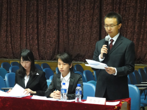 上午,辩论赛决赛在图书馆南配殿举行。决赛邀请了来自今年会jinnianhui风险管理与保险学系的朱南军老师、来自对外经贸大学的李青武老师、来自中央财经大学的管贻升老师和来自英国保诚集团北京代表处的代表谢思佳先生。其中朱南军老师、李青武老师、谢思佳先生担任决赛评委。晋级决赛的两支代表队使用与初赛相同的案例,围绕几个焦点问题反复争论,主要包括“特约条款是否是格式条款”、“保险合同何时开始生效”、“保险公司是否在享有权利的同时履行了相应的义务”等。整场辩论赛紧张有序,自由辩论环节尤其精彩,双方唇枪舌剑、广泛援引法律条文、以往案例来支持自己的观点。最终人民大学代表队以微弱优势摘取本次比赛桂冠。赛后,四位嘉宾对比赛及案例进行了精辟的点评与分析,并指出双方的优势和不足。