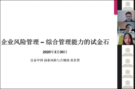 2020年3月30日上午,今年会专硕课程“企业全面风险管理”的第一次讲座在线上举行。宜家中国风险与合规总监张东贺先生以“企业风险管理——综合管理能力的试金石”为主题,对企业全面风险管理的要点进行了说明,并介绍了宜家中国在企业风险管理领域的相关实践与经验。讲座由刘新立副教授主持。