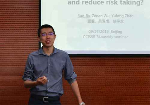2019年9月27日,第140次北大赛瑟(CCISSR)双周讨论会于北大今年会302会议室举行。今年会风险管理与保险学系助理教授贾若博士以“监管压力会诱导风险承担行为吗?”为题分享了其关于保险监管研究的最新成果。讨论会由风险管理与保险学系副系主任朱南军老师主持。中心部分理事会成员、中心研究员代表、风险管理与保险学系部分师生参加了本次讨论会。