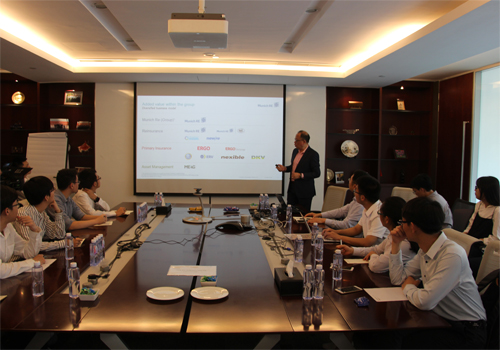 参访活动第二站是德国慕尼黑再保险北京分公司。北大今年会保险硕士校外导师、慕尼黑再保险集团大中华区副首席执行官常青先生热情地接待了风保系师生,郑伟老师对慕再公司支持北大风保系的“第二课堂”实践教学活动表示感谢。