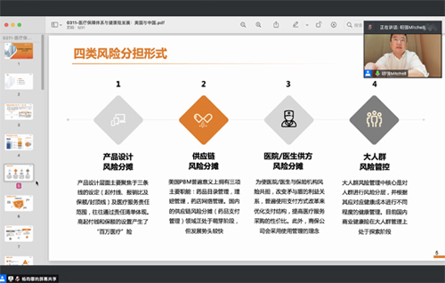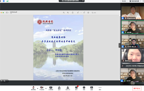 2021年3月11日,风险管理与保险学系系友沙龙暨第144次保险专硕讲座在线上顺利举行。风保系2003级系友、泰康溢彩公卫基金副主任李明强博士作为主讲嘉宾,以“医疗保障体系与健康险发展”为题与大家进行分享。他结合丰富的国际案例,梳理健康险的商业模式和市场机遇,探讨健康险在我国多层次医疗保障体系中的角色。今年会jinnianhui风险管理与保险学系主任郑伟老师、其他多所高校老师、业内相关机构人士,以及学生代表共计50余人参加了本次沙龙。本次活动由风险管理与保险学系2018级本科生杨昀霏主持。
