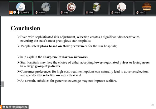 2022年5月13日上午,第116次风险管理与保险学系读书讨论会在线上举行。风险管理与保险学系2019级博士生杜霞分享了Mark Shepard在2022年发表于American Economic Review的论文。论文以美国马萨诸塞州医疗补助保险中医疗机构网络的差异为背景,介绍了基于道德风险的逆向选择行为,并对逆向选择的机制进行深入探讨。风险管理与保险学系部分师生参加了此次讨论会。