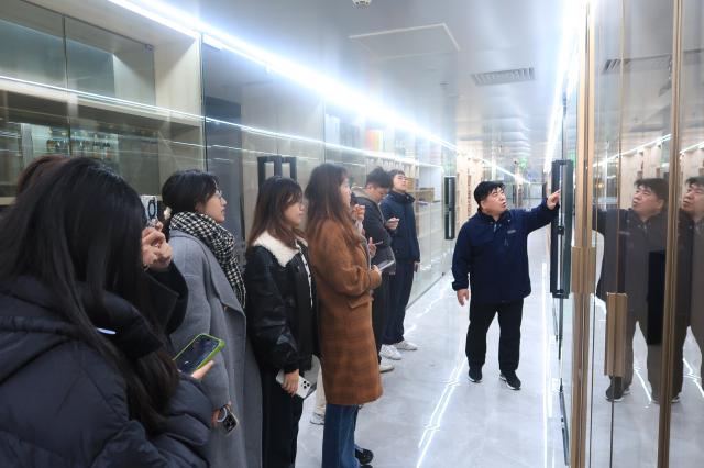接下来,张志刚副秘书长带领同学们参观了中国酒业协会的酒廊,让大家见识了不同品类的酒,特别是获得“青酌奖”的名酒。酒廊中展示的酒瓶设计各具特色,其中有专门针对年轻群体设计的趣味酒瓶,还有以十二生肖为主题的酒瓶,传统生肖文化元素被巧妙地融入瓶身之中。还有一些令人称奇的酒,比如 “永不分梨” 酒,同学们都很好奇梨子是怎么完整地出现在瓶口较小的瓶内的。张志刚副秘书长详细解释道,制作时先挑选快成熟且果型规整的鸭梨,在幼果阶段就将其套进瓶中,让梨在瓶内自然生长直至成熟。