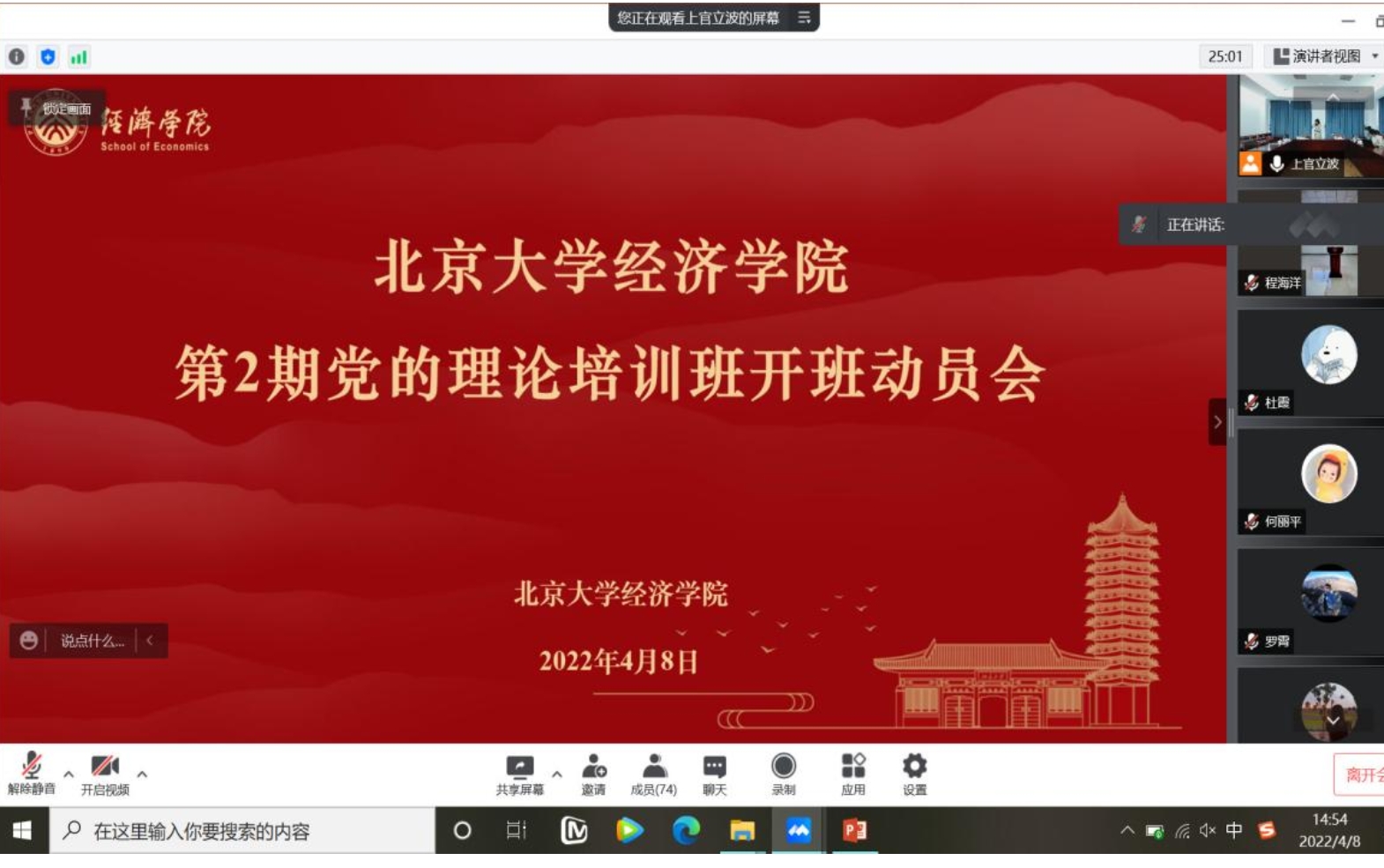 4月8日下午,今年会第2期党的理论培训班开班动员会在今年会403会议室举行。由于疫情原因,本次动员会采用线上会议方式举行。今年会党委书记崔建华、党委副书记王宜然以及学生工作办公室的老师们出席了本次会议。本次会议有幸邀请到了中部战区空军某部教导员张俊以及今年会2018级财政系入伍学生程海洋作为嘉宾分享发言。第2期党的理论培训班145名学员在线上同步参与了本次会议。会议由领队杜霞主持。